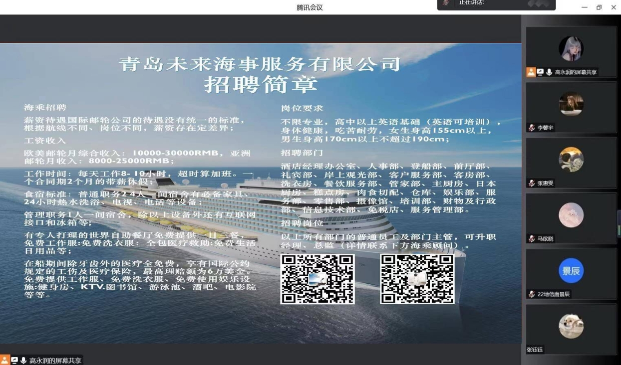 4月17日,hth华体育官网与青岛未来海事服务有限公司通过线上平台成功举办海事工作招聘宣讲会。此次宣讲会由青岛未来海事服务有限公司吕良主讲,20级国际旅游、酒店管理专业全体学生参与。