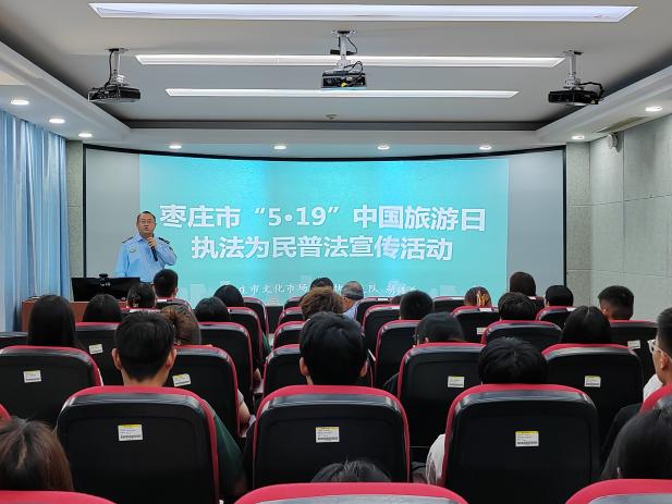 为增强旅游法治宣传教育,提高hth华体育官网学子旅游安全及规范从业意识,5月19日,hth华体育官网联合枣庄市文化市场综合执法支队于综合楼1608教室开展中国旅游日普法宣传活动。活动邀请枣庄市文化市场综合执法支队稽查四科负责人胡修岳进行专题报告,枣庄市文化市场综合执法支队副支队长、二级高级主办孙咏、枣庄市文化市场综合执法支队四级主办孙亚如、hth华体育官网党总支副书记韩建敏、旅游管理专业部分教师及学生参与本次活动。