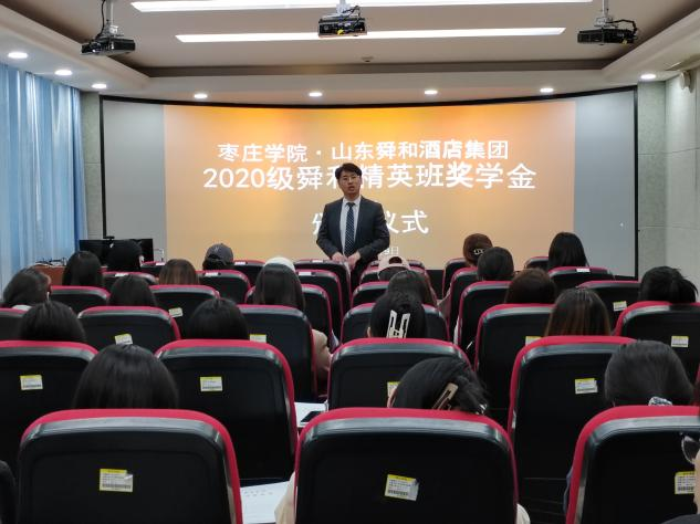 5月9日上午,2020级舜和精英班奖学金颁发仪式在综合楼1608教室举行。山东舜和酒店集团人才培训部经理刘康,hth华体育官网党总支副书记韩建敏,旅游管理专业部分教师参加了颁发仪式。颁发仪式由酒店管理专业负责人王唯副教授主持。