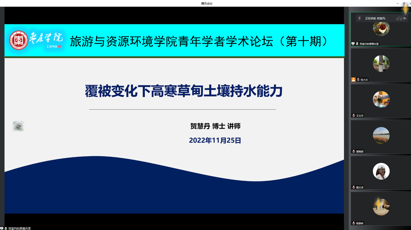 报告会上,贺慧丹博士做了“覆被变化下高寒草甸土壤持水能力”的学术报告,介绍了青藏高原在调节气候、固碳持水、维持生物多样性等多方面的重要作用,着重强调了高寒草甸在水源涵养方面的独特生态价值,其持水能力是水源涵养功能的重要指标之一。以青藏高原不同退化程度、不同放牧梯度、不同封育年限以及人工草地建植年龄梯度的高寒草甸为研究对象,进行植物群落结构、土壤理化性质、土壤持水能力等监测,探讨了高寒草甸地区植被-土壤水分过程和分配模式,揭示了持水能力对覆被变化的响应。报告内容丰富,讲解清晰,增进了与会师生对相关领域学术前沿和发展动态的了解。