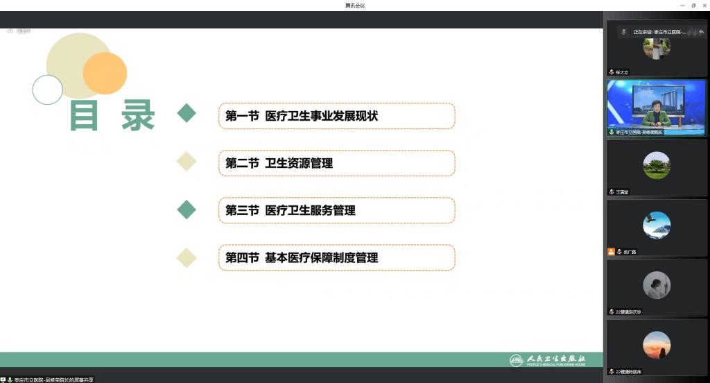 11月11日上午,hth华体育官网邀请枣庄市市立医院院长吴修荣教授通过腾讯会议为2022级健康服务与管理专业学生做专业导读第三讲,报告题目为“医疗卫生事业管理和医院管理”。报告由hth华体育官网院长王满堂主持,健康服务与管理教研室教师及健康服务与管理专业的大一新生参加报告会。