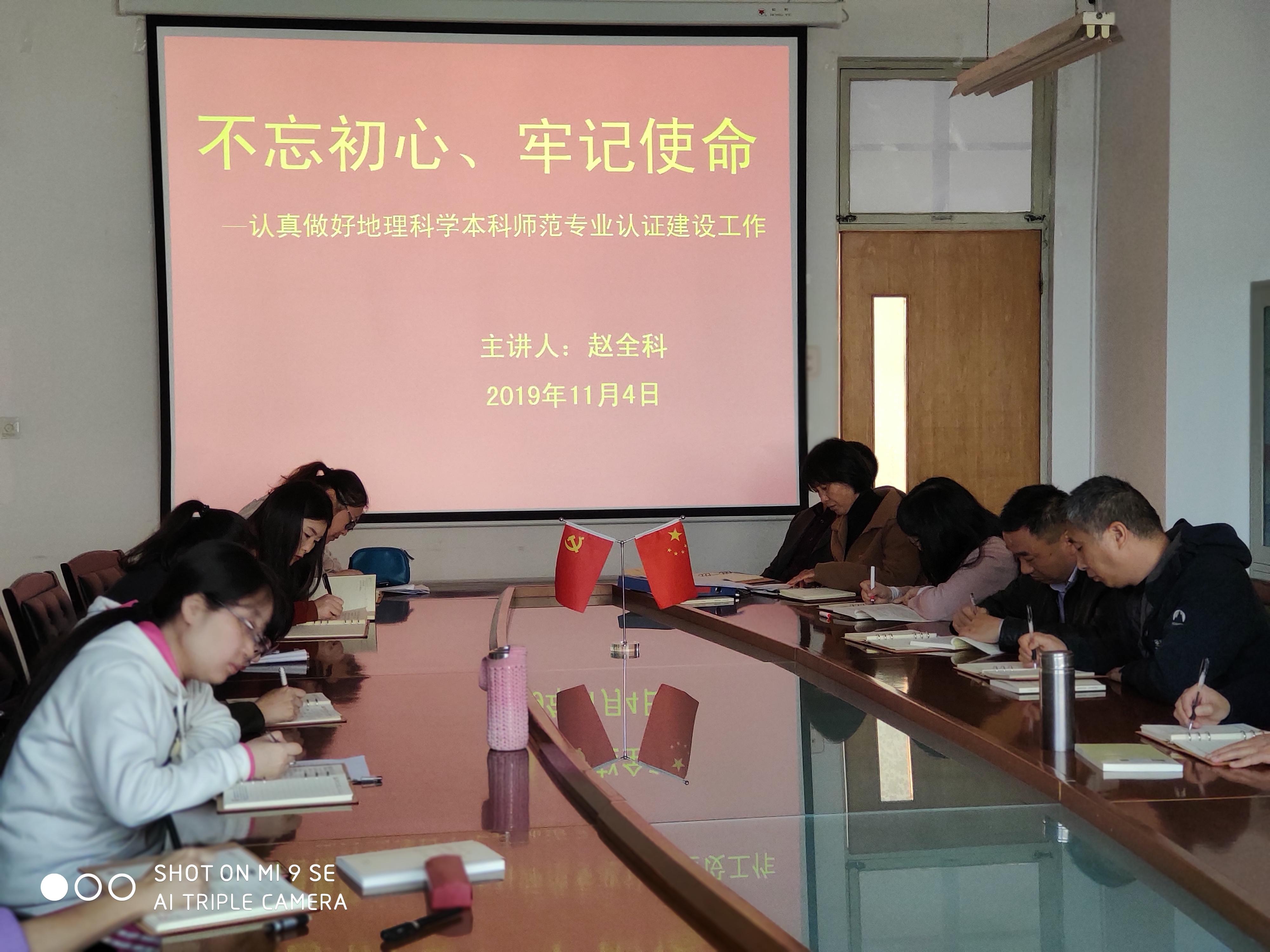 按照学校“不忘初心、牢记使命”主题教育工作部署与要求,11月4日下午,hth华体育官网在理工楼2514会议室开展主题教育专题党课活动,院长赵全科讲了题为《不忘初心 、牢记使命—认真做好地理科学本科师范专业认证建设工作》的党课,全体党员聆听了党课。