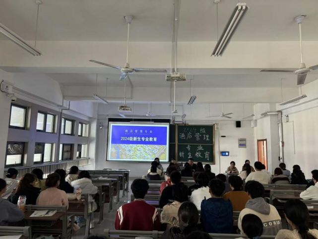 酒店管理教研室主任王唯老师在崇德楼4316教室向新生介绍酒店行业的发展历程、校内外的实习与实训等方面,重点介绍学院对考研、实习等方面的工作部署。随后,专业教师对同学们就课程的学习、课证融通、竞赛和考研等提出的问题进行现场解答。