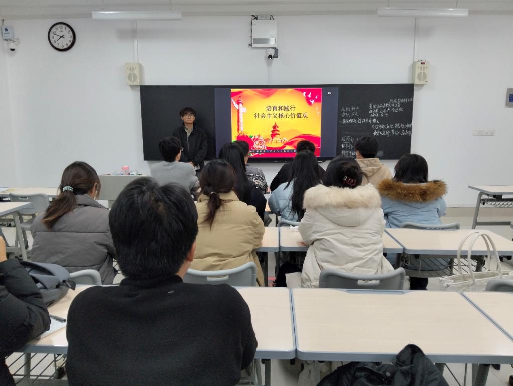 活动伊始,主讲人结合ppt,通过丰富多样的图文材料,将社会主义核心价值观的理论知识与具体实例相结合,从发展历程、基本内容、重要意义及如何贯彻等多个方面进行阐述。主讲人强调,社会主义核心价值观是我们民族宝贵的精神财富。随后他指出,学生们要以社会主义核心价值观为指引,树立正确的世界观、人生观、价值观,不断提升自己的思想觉悟和道德水平,并坚定不移应用到实践中去。最后,他激励同学们要树立远大的理想和目标,勤奋学习、追求卓越,将社会主义核心价值观中的“敬业”精神落实到学业中,为未来投身于社会主义建设事业储备知识和技能,在成长的道路上不断拼搏奋进。