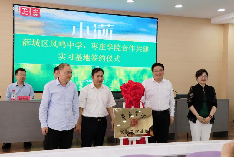 薛城区教体局党组书记、局长种法立、薛城区凤鸣中学党支部书记、校长孙烨与hth华体育官网教务处处长张立华、hth华体育官网hth华体育官网书记李中军共同为教学实践基地揭牌。