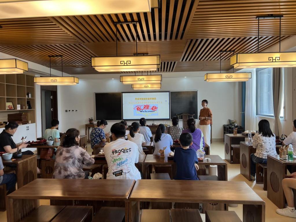 在茶艺实训室,跟随张亚利和王文杰两位老师学习了中国茶文化的发展历史,现场展示并认识了我国的六大茶类,在此基础上了解了基本的茶具以及冲泡方法,并进行了品尝。在酒吧实训室,由杨坤老师带领大家了解了中国酒文化的发展历史以及世界各类酒水类型,学习了咖啡知识,观摩了其制作过程,并进行品尝。