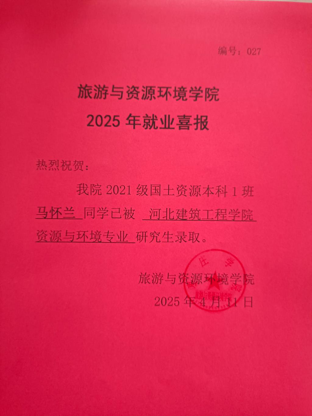 喜报!21国土资源本科1班马怀兰被河北建筑工程学院录取!